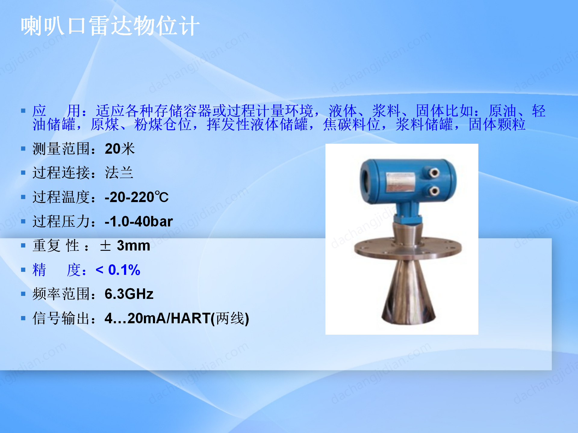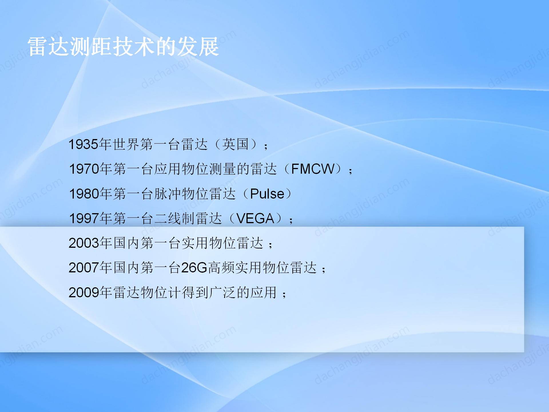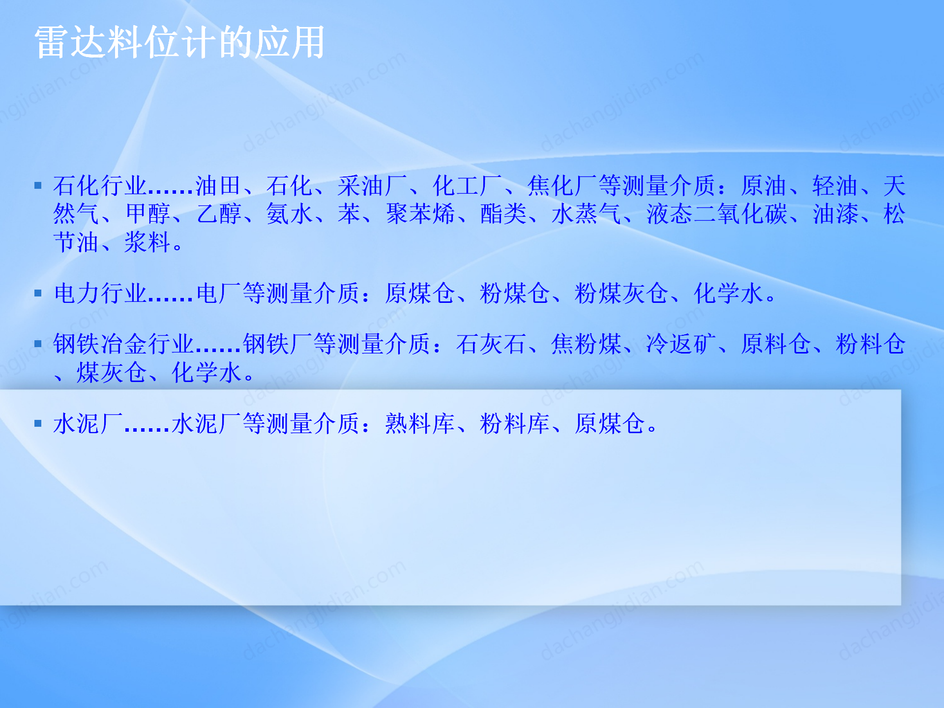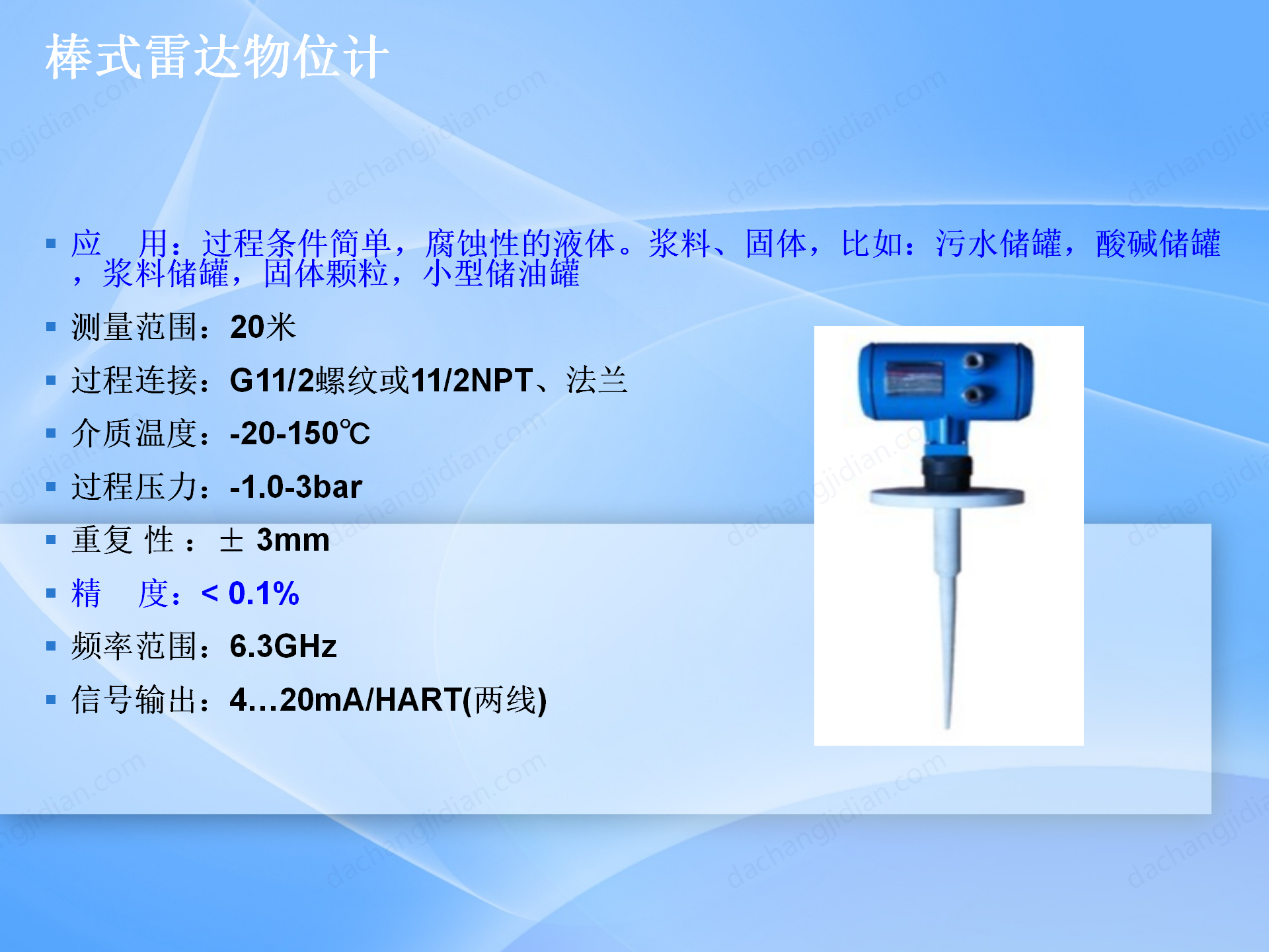 雷達物位計是取代浮筒物位計(變送器)和射頻導納(電容)液位物位計(變送器)的更新換代產品。它與浮筒物位計相比不受介質比重的影響,與射頻導納(電容)液位物位計相比不受介電常數變化的影響。不需要現場校調,只需輸入物位數據進行組態即可,是現有的任何一種物位計測量儀表都無可比擬的優點。