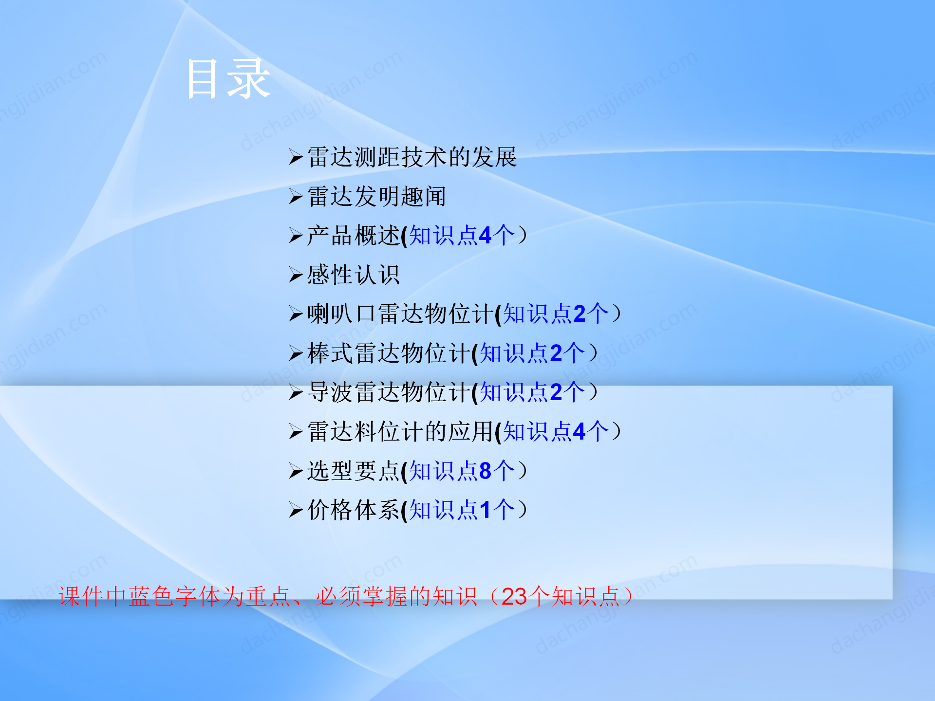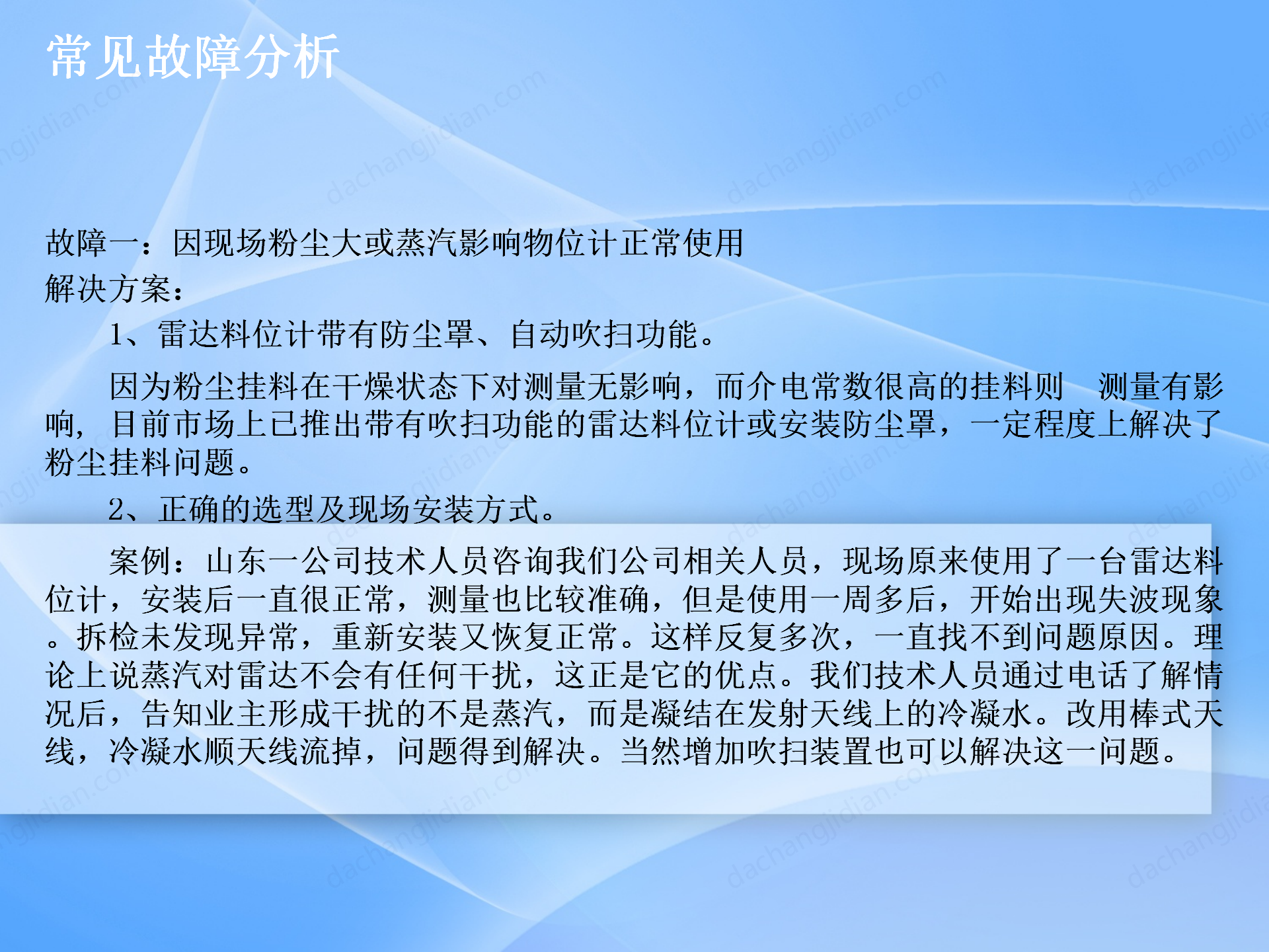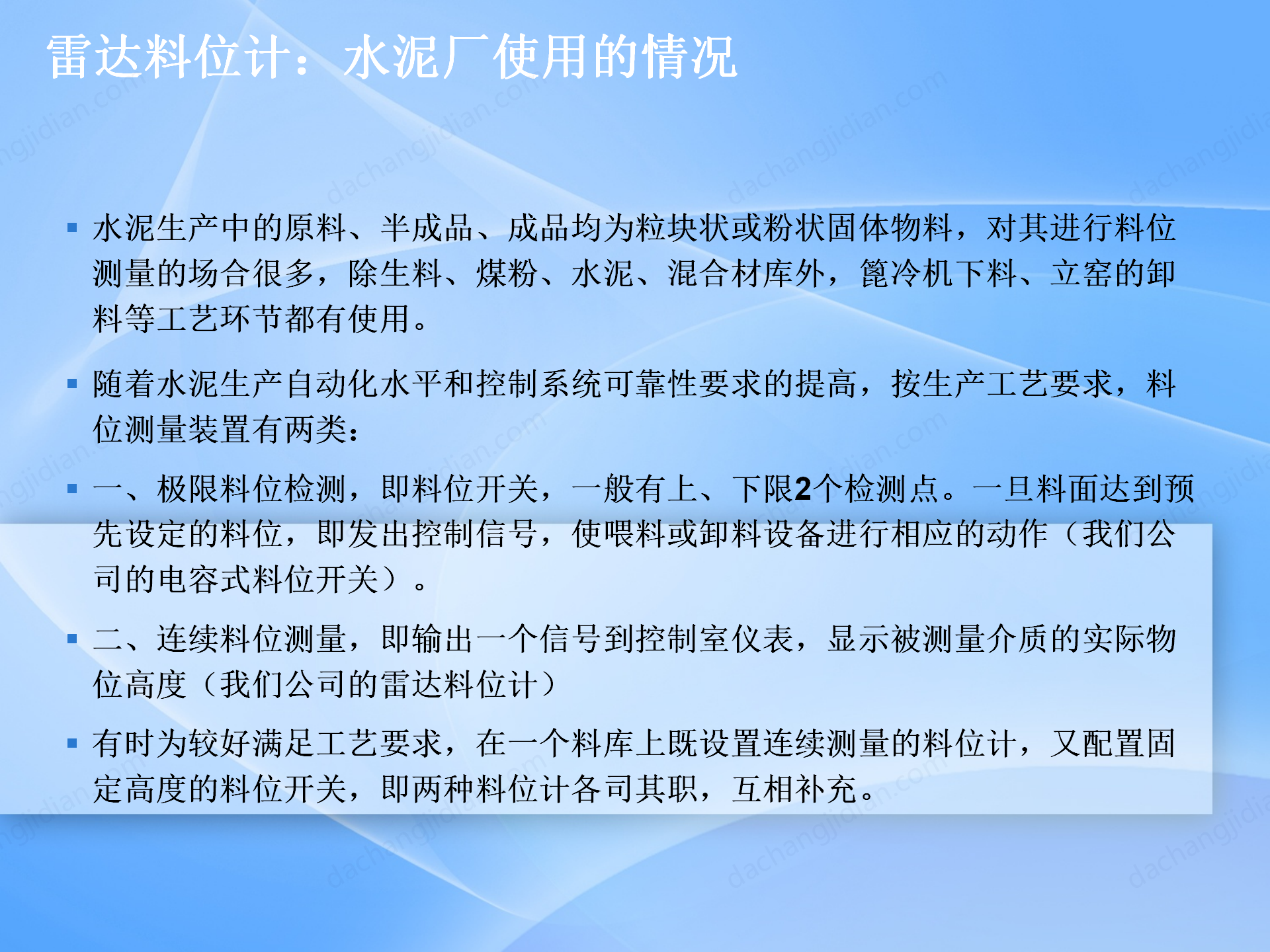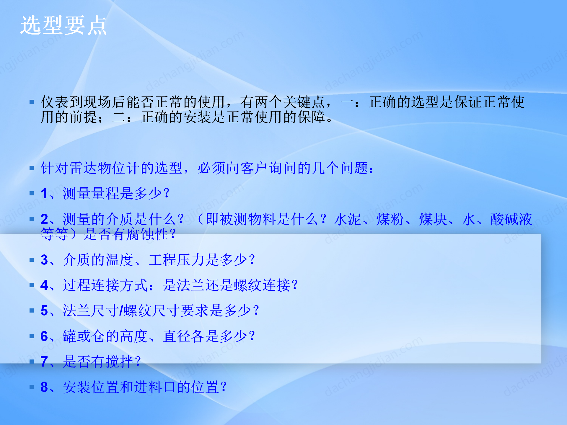 雷達物位計是取代浮筒物位計(變送器)和射頻導納(電容)液位物位計(變送器)的更新換代產品。它與浮筒物位計相比不受介質比重的影響,與射頻導納(電容)液位物位計相比不受介電常數變化的影響。不需要現場校調,只需輸入物位數據進行組態即可,是現有的任何一種物位計測量儀表都無可比擬的優點。